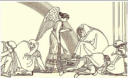 Iris je v gréckej mytológii stelesnením dúhy, symbolu nádeje a prísľubu, že prídu lepšie časy. Iris mala dovolené vstupovať aj do podsvetia a na Olymp prinášať posvätnú vodu z rieky. Starala sa o unavených, krmila ich a podávala im nápoje. Ľudia sa k nej utiekali v bolestiach, modlili sa k nej v nádeji na skoré utíšenie všetkého zlého. V mýtoch sa uvádza, že okrem iného odviedla zranenú Afroditu z bojov pred bránami mesta Trója. Na príkaz Héry odstrihla zomierajúcej Didó kader a tak vyslobodila jej dušu z tela. Kedže v gréckej mytológii duša z tela vystupuje cez oči, pomenovanie po Iris dostala dúhovka oka.